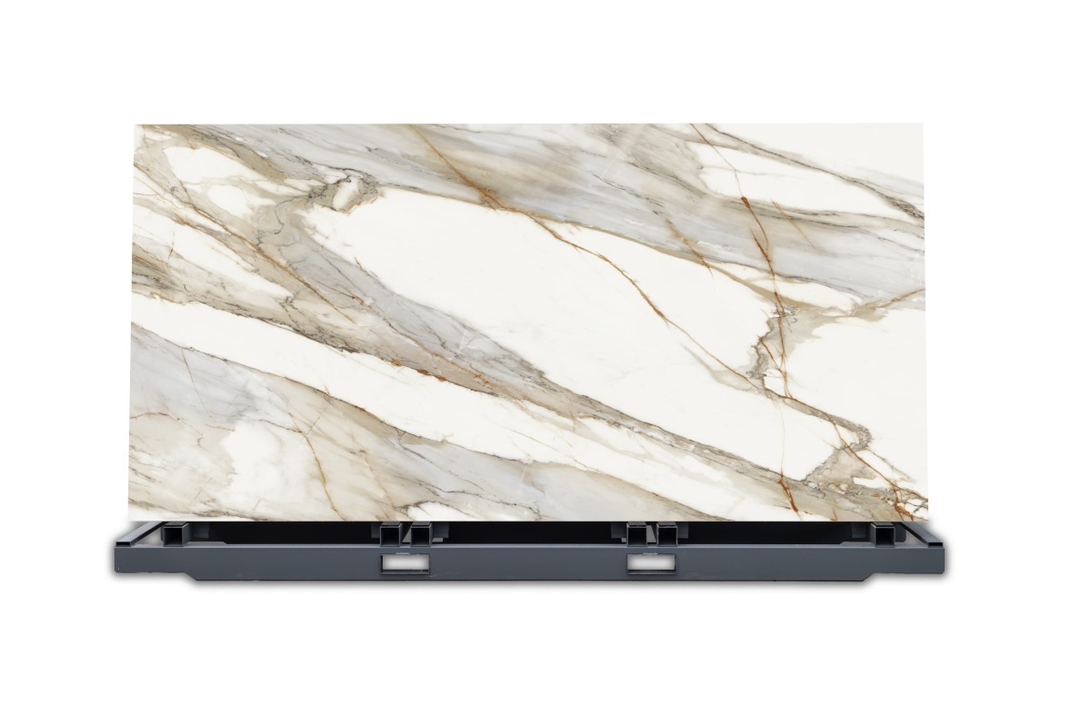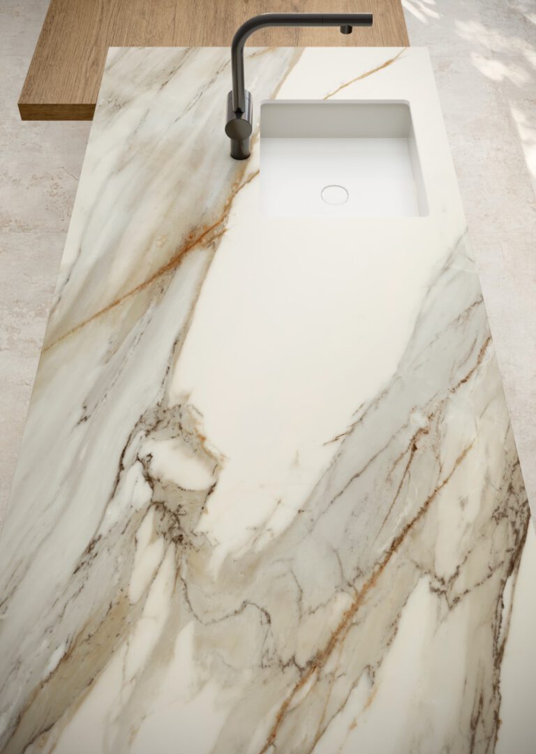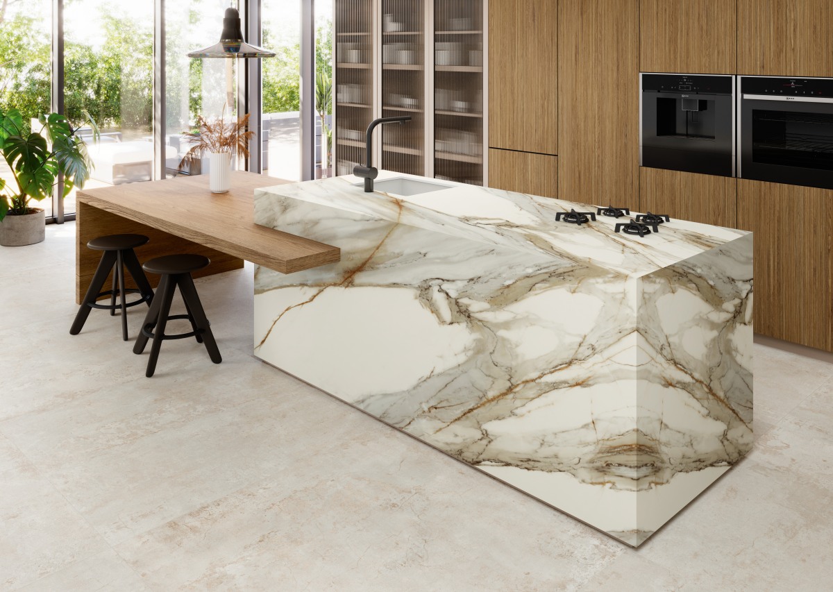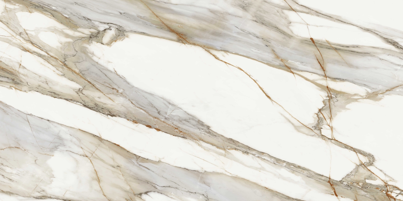 Las maxis vetas son las auténticas protagonistas de la serie Macchia Vecchia. Elegantes vetas transversales en tonalidades grises y doradas que fluyen de forma elegante.